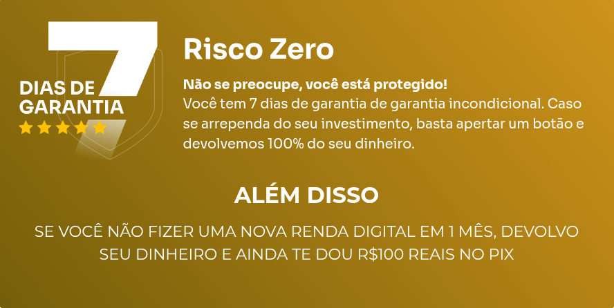 Você tem 7 dias de garantia incondicional. Caso se arrependa do seu investimento, basta apertar um botão e devolvemos 100% do seu dinheiro.